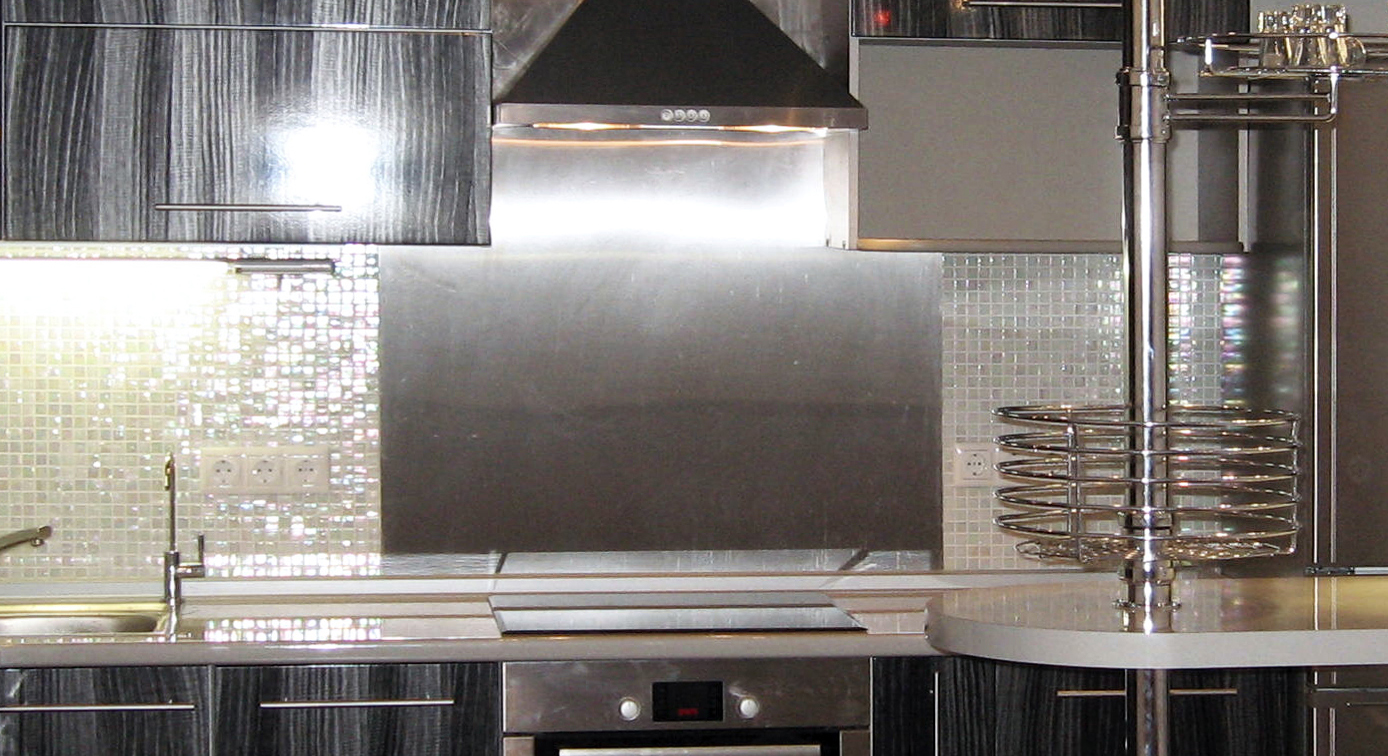 Декоративная стеновая панель может быть двух исполнений : из черного стекла и нержавеющей стали. Крепится к стенке с помощью клея в область между столешницей и нижней частью кухонной вытяжки. Габаритные размеры ( ШхВ ),мм : 900Х650