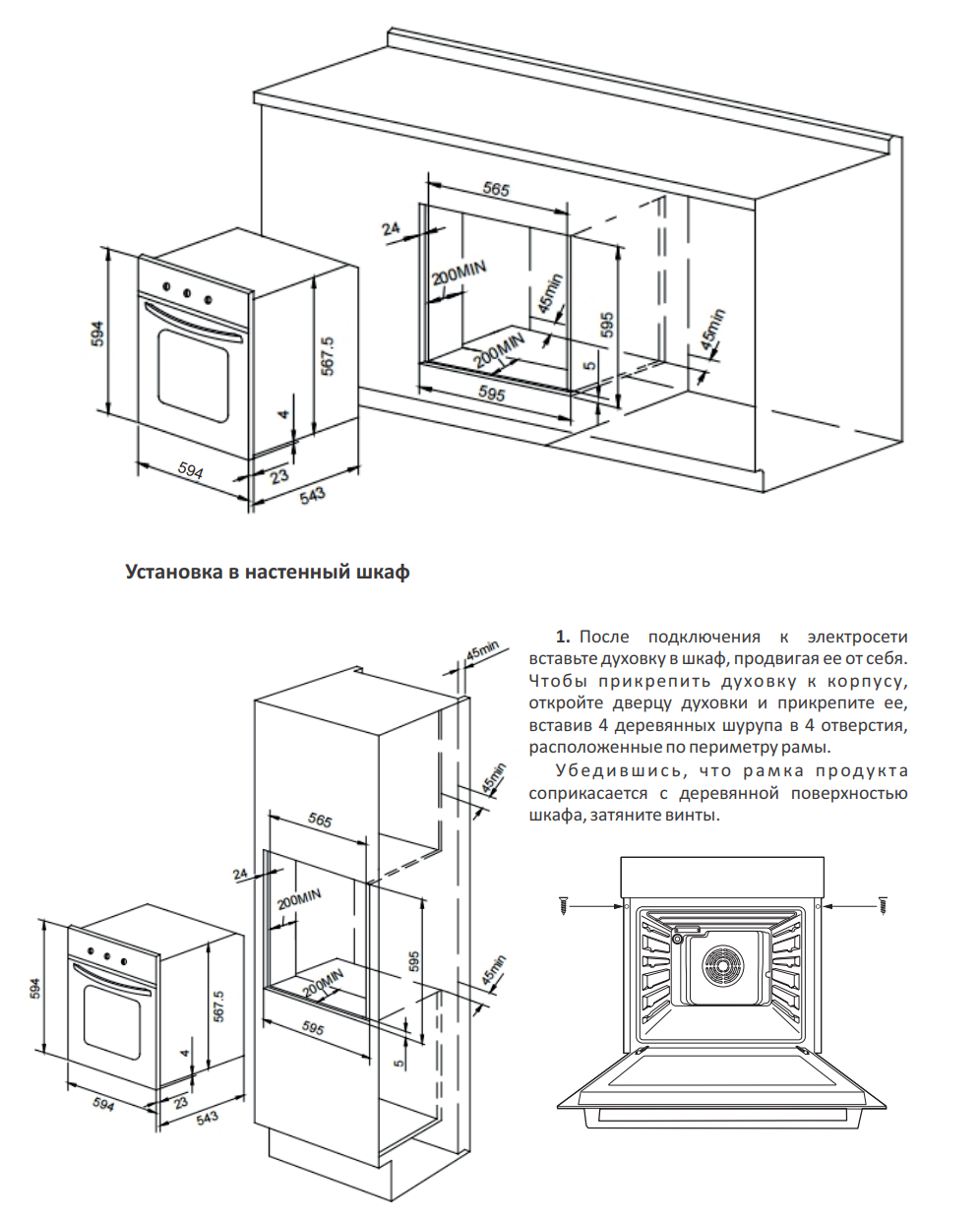 | В комплекте | - Глубокий противень, глубиной 40 мм из эмалированной стали - Хромированная решётка - Универсальный противень стандартной глубины 20 мм из эмалированной стали - 2 винта для крепления духового шкафа в кухне - Инструкция по эксплуатации - Схема монтажа (в инструкции) | |