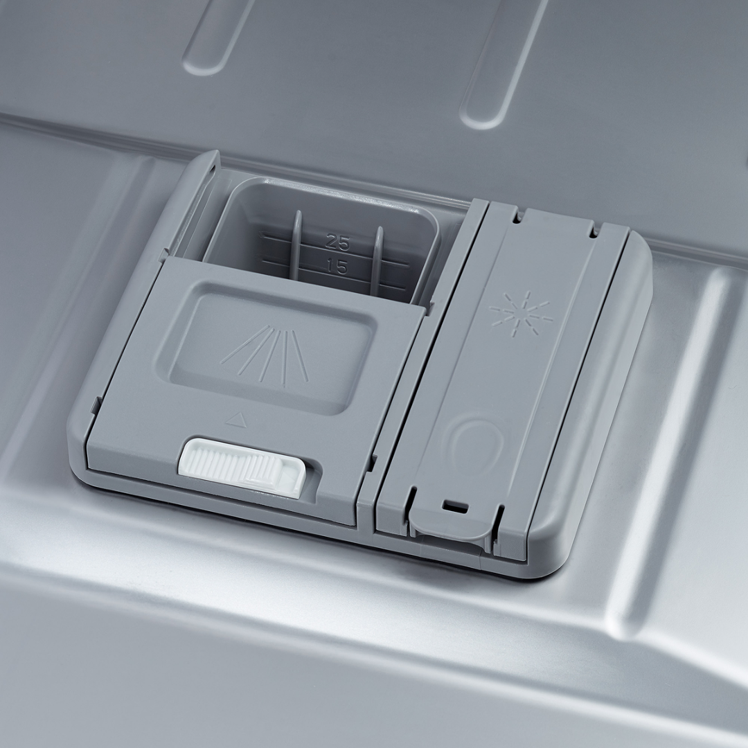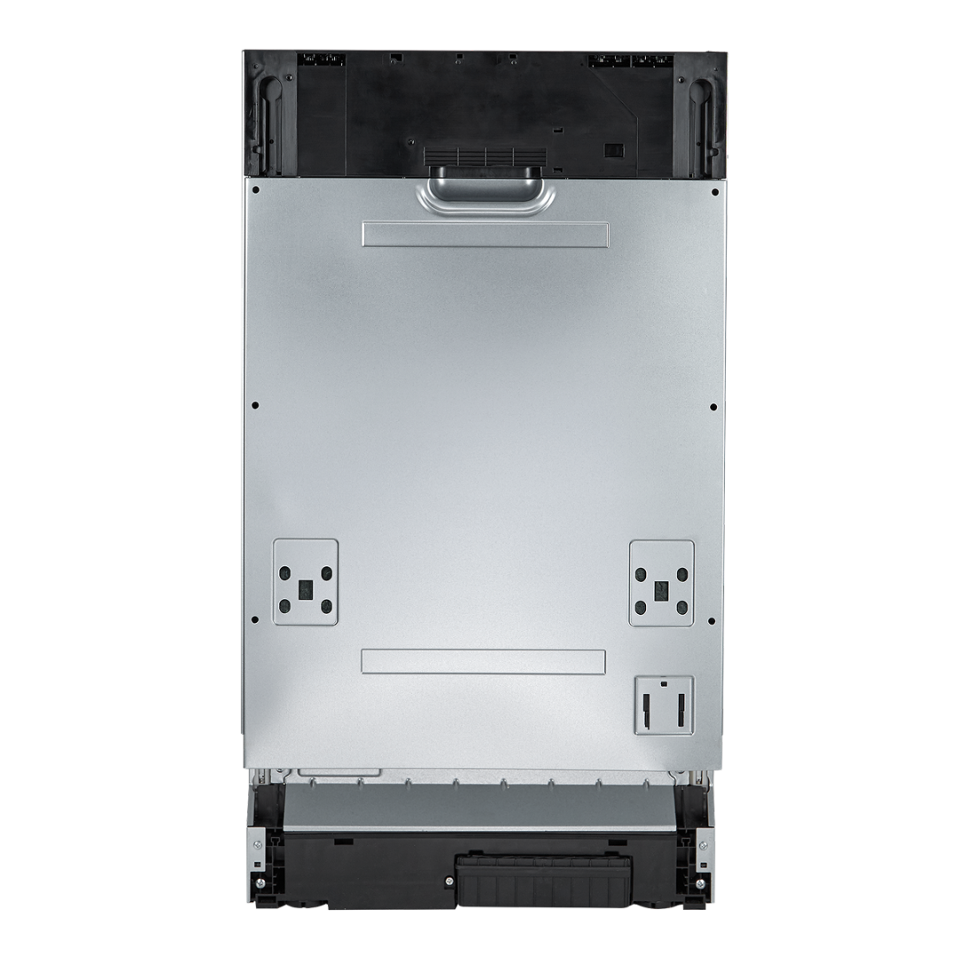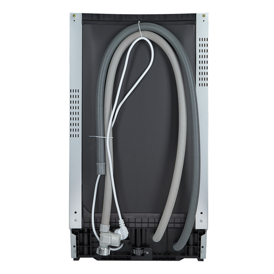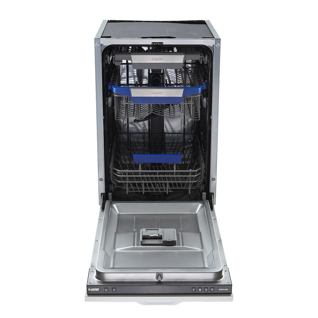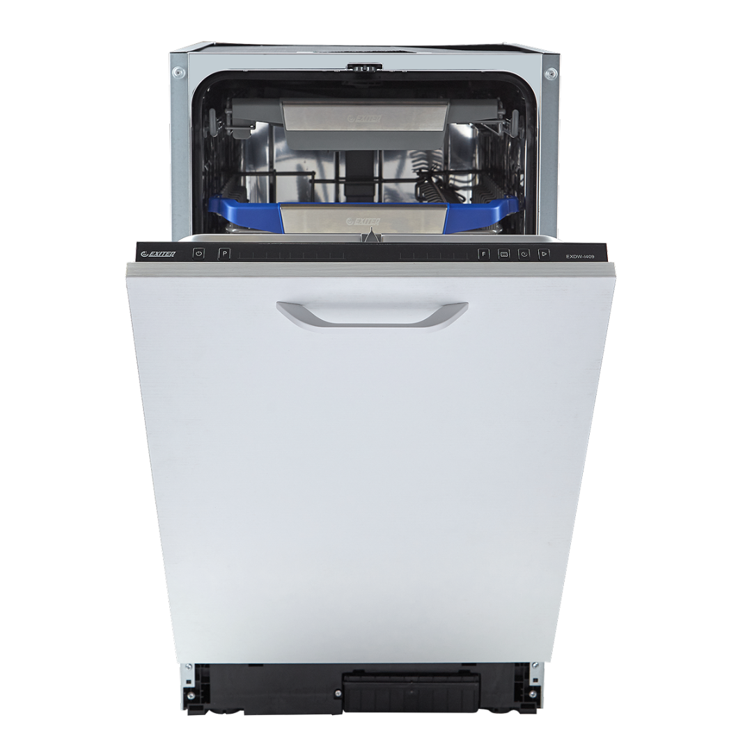 EXDW-I409 – это полновстраиваемая посудомоечная машина: она полностью прячется под столешницу и закрывается спереди навесным фасадом. Посудомоечная машина подключается к холодной воде, нагрев воды производится в нутри устройства. Благодаря этому нет зависимости от сезонного отключения горячей воды.