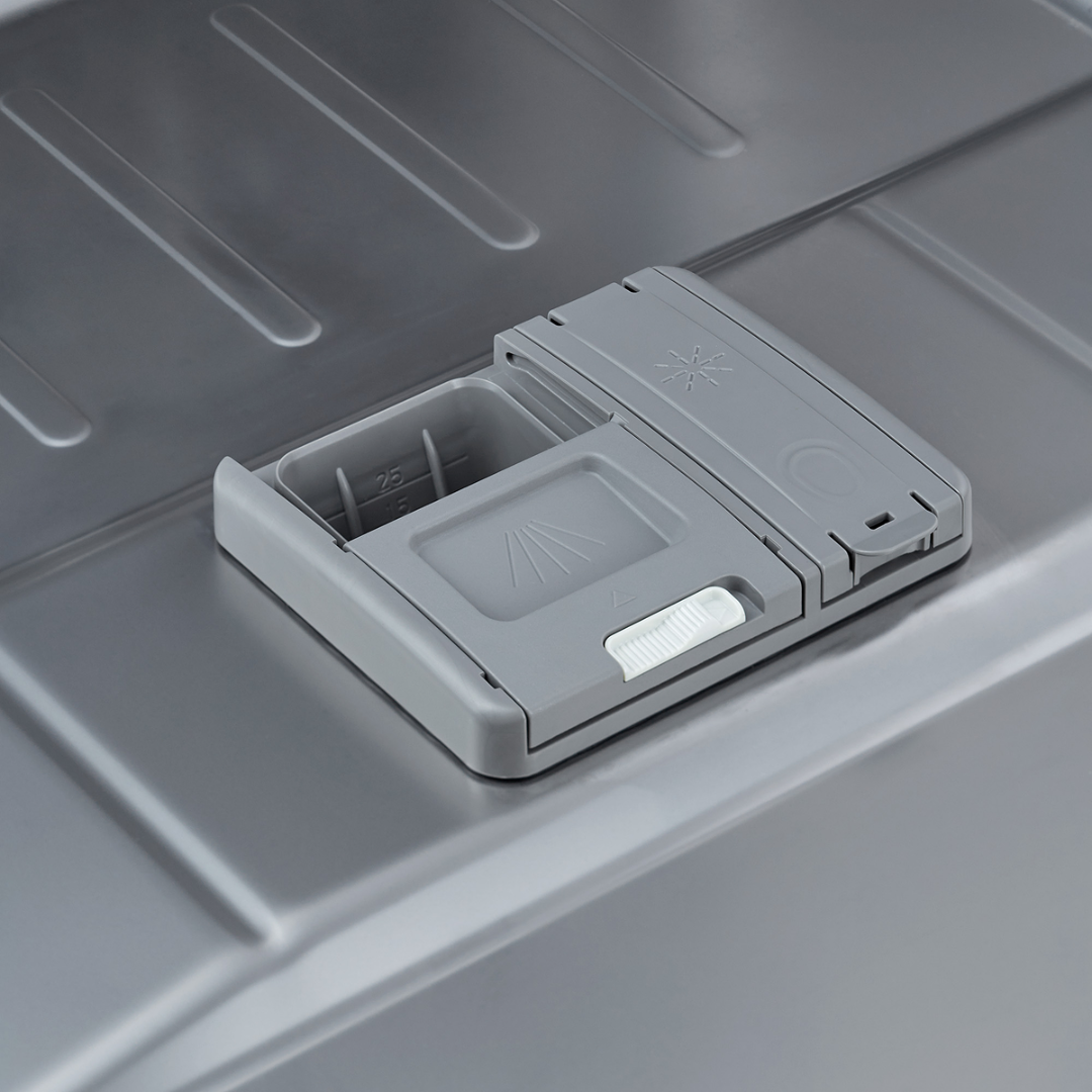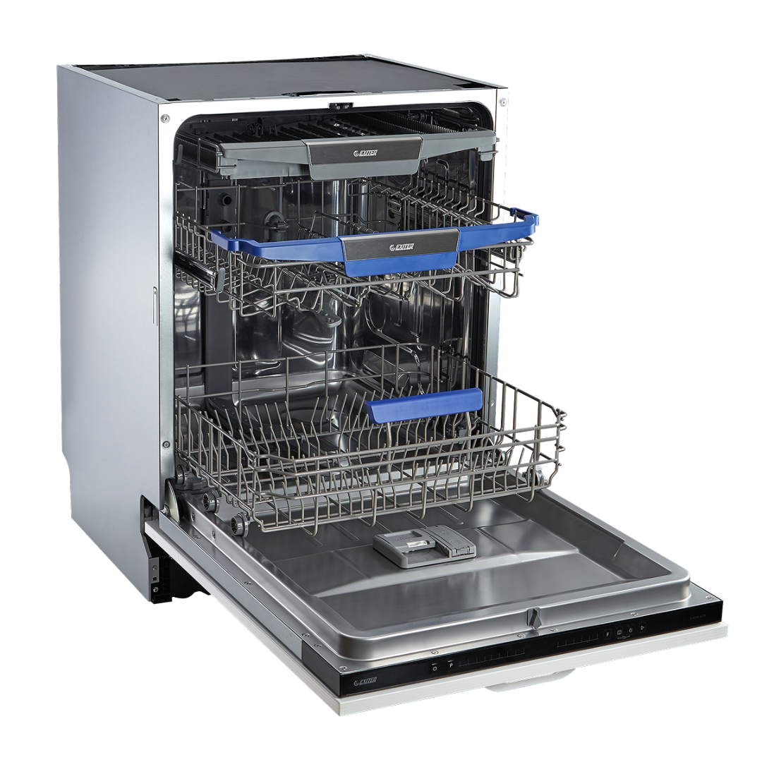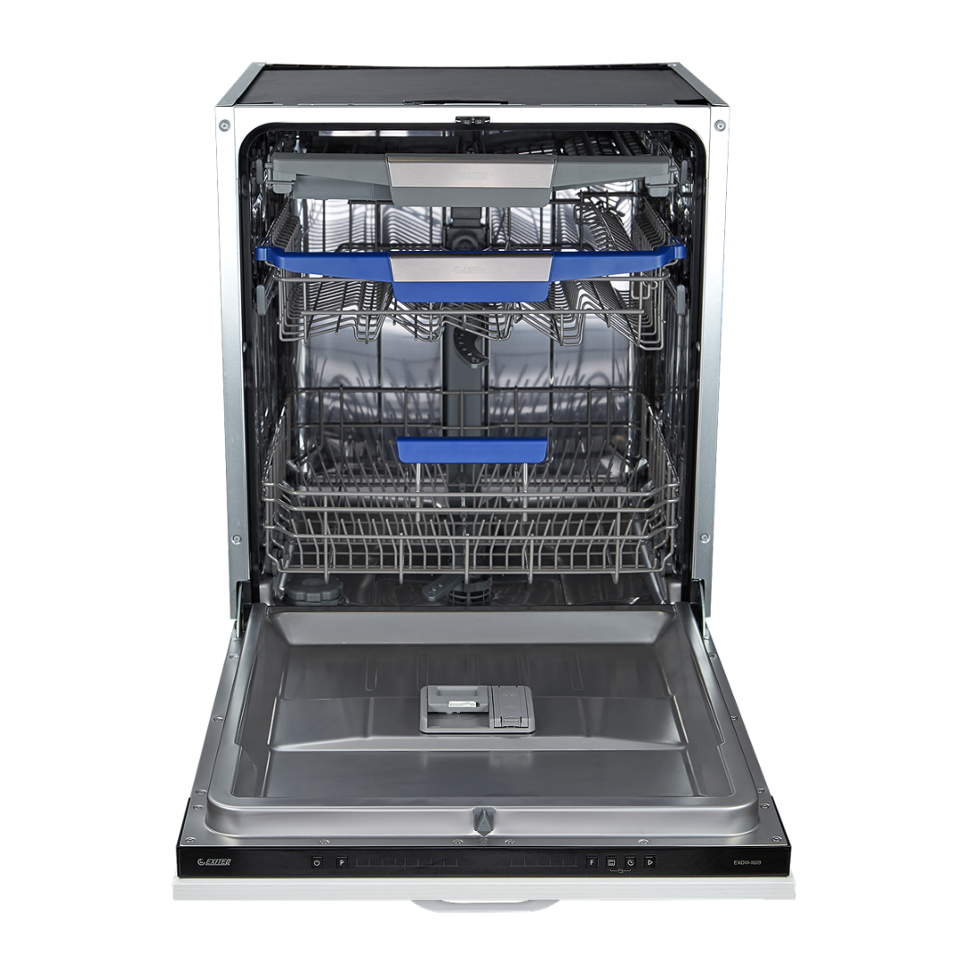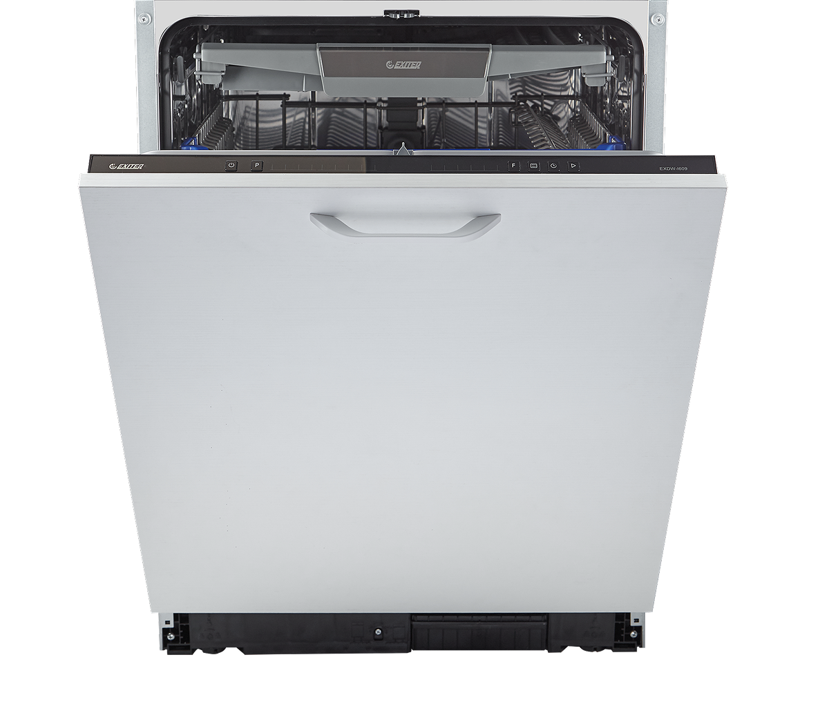 EXDW-I609 – это полновстраиваемая посудомоечная машина: она полностью прячется под столешницу и закрывается спереди навесным фасадом. Посудомоечная машина подключается к холодной воде, нагрев воды производится в нутри устройства. Благодаря этому нет зависимости от сезонного отключения горячей воды.