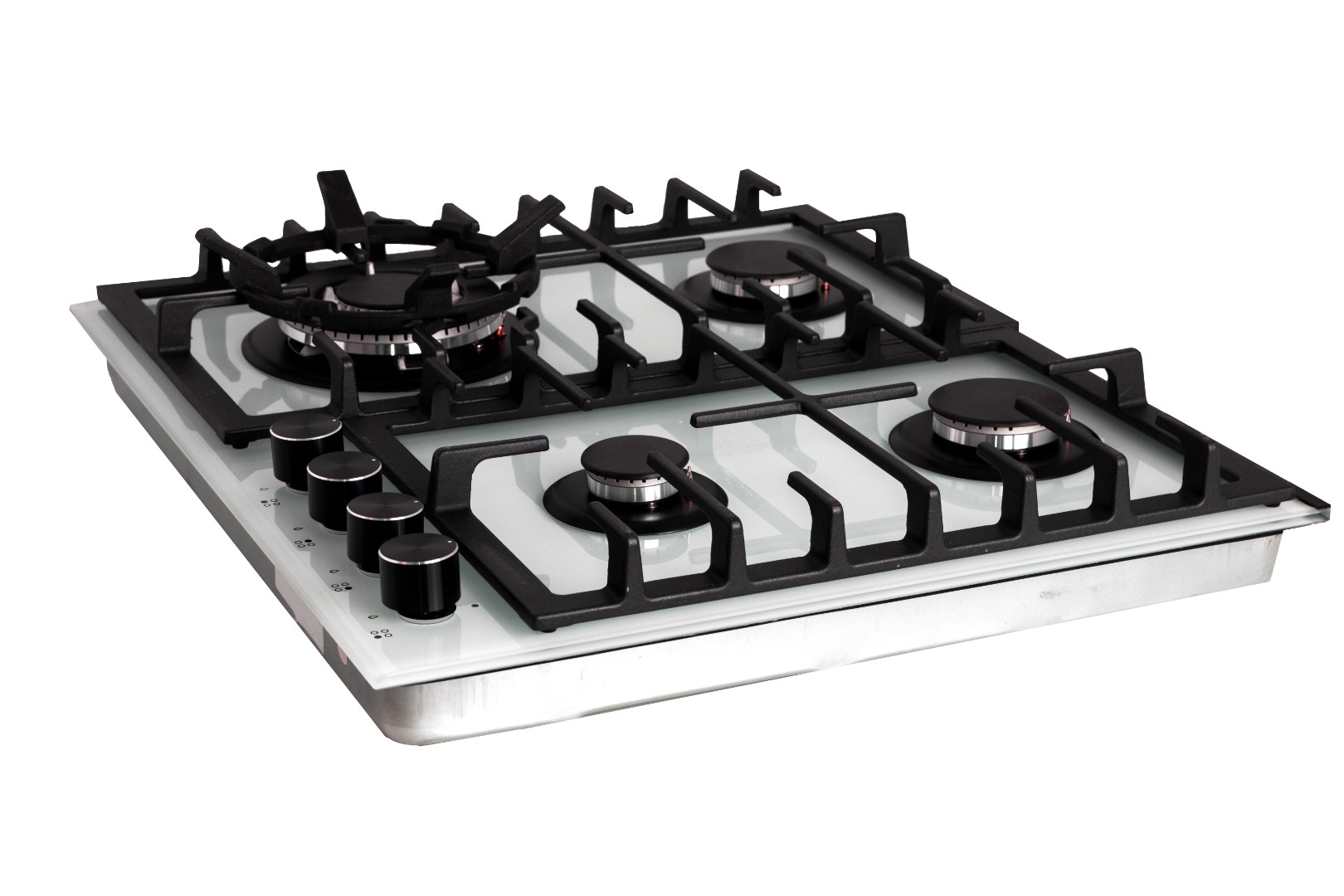 Панель оборудована четырьмя конфорками, в том числе 1 трехконтурной мощной конфоркой. Подача газа регулируется при помощи поворотных ручек.